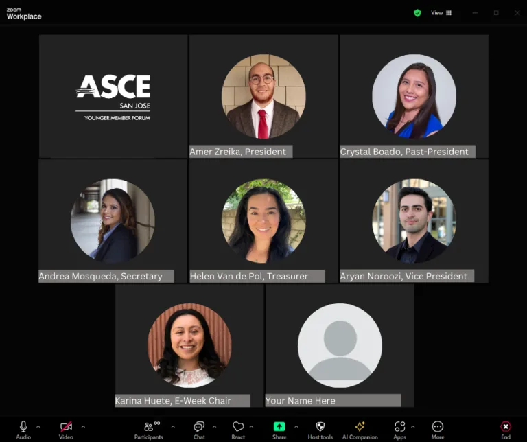 The ASCE San Jose Younger Member Forum meets on the fourth Wednesday of every month from 6:00 PM to 7:00 PM to discuss upcoming events, ASCE news, and other member happenings. Board meetings are open to all ASCE members, civil engineering professionals, and students. Meeting format (i.e. in-person or virtual) varies on a month-to-month basis.